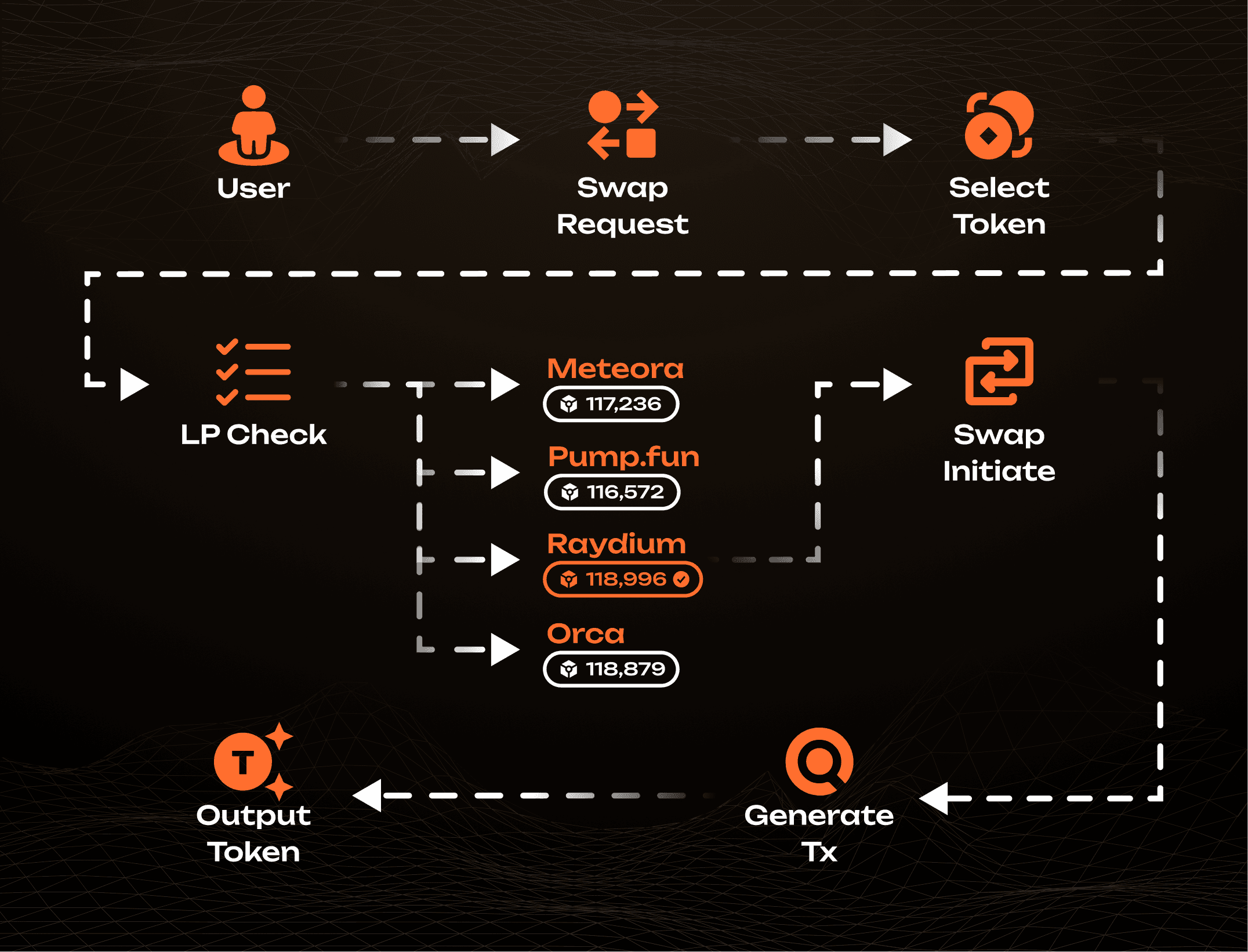 Ultra-fast swap computation designed for snipers and latency-sensitive flows. Receive optimized routes and executable instructions in real time; no bottlenecks, no guesswork.